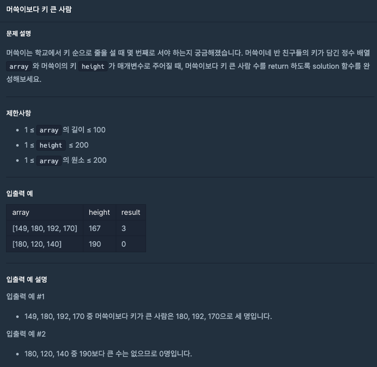 - 매개변수로 주어지는 array를 반복문을 돌려서 만약 person에 들어오는 원소가 height보다 크다면, count를 +1 한다.